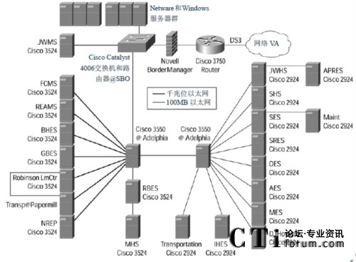 WAN。每所學校都在布線室中安 裝了一臺自己的 Cisco Catalyst 3524 或者 2924 交換機,并為每個桌面提供了 10Mbps