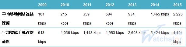 2009年到2010年一年間,平均移動(dòng)網(wǎng)絡(luò)連接速度提升一倍,預(yù)期到2015年將會(huì)增加10倍。移動(dòng)網(wǎng)絡(luò)連接速度是支持移動(dòng)數(shù)據(jù)增長(zhǎng)的主要因素。