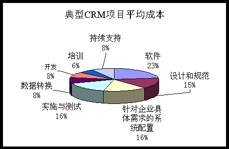 在企業(yè)確定了符合需求的CRM解決方案,包括軟件、供應(yīng)商以及技術(shù)性能之后,仍然有很多其他因素值得考慮。最主要的因素之一即成本。典型的項目的預(yù)算成本中軟件成本占1/3,咨詢、實施和培訓(xùn)成本占2/3。如下圖所示: