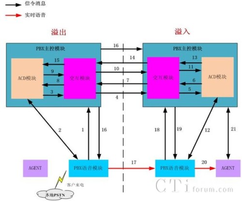 通過PBX/ACD建立一種電話路由共享和語音溢出的方法,實現(xiàn)多套聯(lián)絡中心平臺之間語音的動態(tài)互溢,透明地為客戶提供優(yōu)質(zhì)、及時的電話服務,客戶感覺不到任何差異。通過PBX/ACD建立一種電話路由共享和語音溢出的方法,作為行業(yè)現(xiàn)有實現(xiàn)方法的有效補充,解決了行業(yè)現(xiàn)有實現(xiàn)方法的無法實現(xiàn)最短路徑溢出問題,通過ACD的“先排隊后進門”的預約預定模式,動態(tài)判斷彼此的運行狀態(tài)和處理能力,無需先將語音溢出到另外一個聯(lián)絡中心,只有當另外一個聯(lián)絡中心確定能提供相應的語音服務和人工服務的時候,語音才在PBX語音層面通過標準通信協(xié)議進行互聯(lián)互通,避免實時語音被多次溢出,實時實時語音溢出只走最短路徑,保證客戶電話只需一次溢出就能立即提供語音服務和人工服務,大幅減少了語音溢出的處理時間,同時也大幅減少了語音處理次數(shù),提升了系統(tǒng)處理性能。