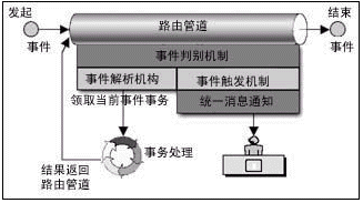 在路由管道中流轉(zhuǎn)著加載了業(yè)務(wù)的工作流事件。事件按照事先定義的路由規(guī)則流轉(zhuǎn),事件的路由規(guī)則定義了事件在路由管道中可以停靠的“站臺(tái)”,同時(shí)定義了事件到達(dá)“站臺(tái)”時(shí)可以領(lǐng)取并處理加載在事件上的業(yè)務(wù)的角色。事件從始發(fā)站臺(tái)進(jìn)入路由管道,經(jīng)過(guò)一個(gè)或多個(gè)中間站臺(tái),最后到達(dá)終點(diǎn)站。事件每?恳粋(gè)站臺(tái),相關(guān)人員領(lǐng)取事務(wù),并進(jìn)行處理后重新裝載事務(wù),觸發(fā)事件向下一個(gè)站臺(tái)流轉(zhuǎn),除非事件已經(jīng)到達(dá)終點(diǎn)站。