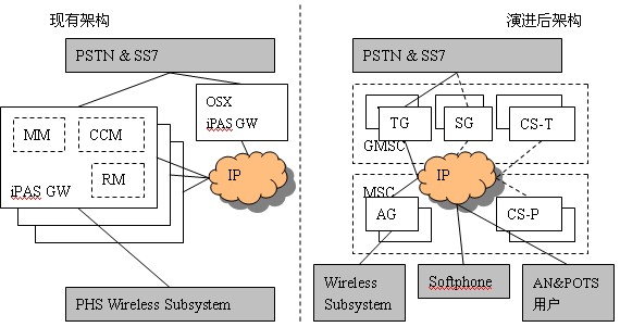 GW軟件改造而來,只需新增CS-P即可。總的來說,核心網(wǎng)的演進(jìn)只是增加CS-P、擴(kuò)容CS-T、原有的iPAS GW軟件升級為TG/AG,就可以建立其一個具有多種終端接入能力的開放性多媒體VoIP移動軟交換網(wǎng)絡(luò),而原有的PHS系統(tǒng)功能又不會受到影響。