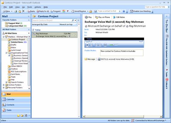 Exchange 統(tǒng)一消息幫助在單個位置合并信息:用戶的收件箱。語音郵件、傳真、電子郵件、約會數(shù)據和聯(lián)系人都出現(xiàn)在單個位置,使得用戶更容易訪問、查找和操作它們。
