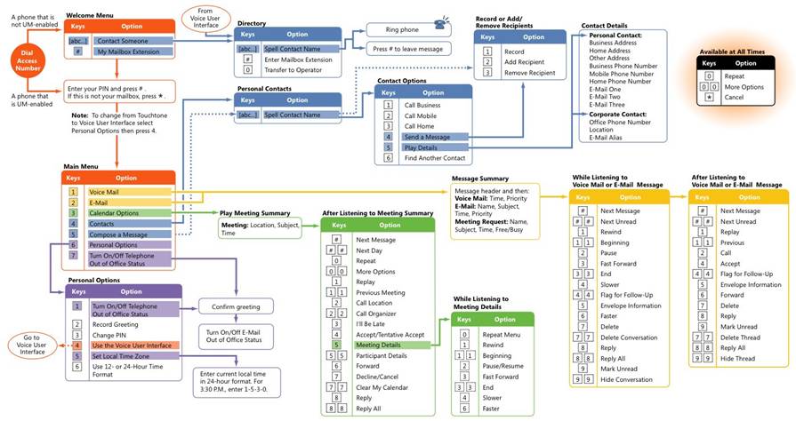允許用戶通過電話處理他們的消息和日歷數(shù)據(包括收聽、轉發(fā)和回復電子郵件,以及發(fā)出、更新或響應會議請求)。用戶可以標記消息以便跟蹤、跳到下一封未讀郵件、隱藏或刪除對話,甚至查找來自特定用戶的消息,這一切全都使用語音導航或標準按鍵式鍵盤來完成。