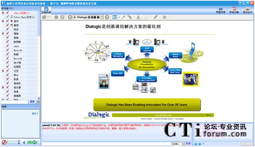 作為最早將3G語(yǔ)音視頻技術(shù)引入中國(guó)的世界級(jí)技術(shù)提供商,Dialogic在語(yǔ)音應(yīng)用和3G視頻一直具有領(lǐng)先競(jìng)爭(zhēng)力。在此次“基于3G視頻呼叫的多媒體業(yè)務(wù)及方案”網(wǎng)絡(luò)研討會(huì)上,Dialogic中國(guó)區(qū)技術(shù)總監(jiān)陳益斌,以音視頻的在線直播方式,親身向與會(huì)觀眾講解Dialogic基于3G視頻呼叫的業(yè)務(wù),以及與3G數(shù)據(jù)業(yè)務(wù)的區(qū)別等前瞻3G視頻技術(shù)。