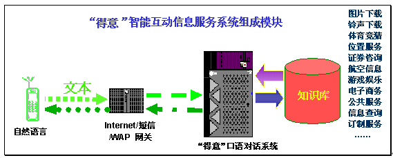 在現(xiàn)有的數(shù)據(jù)通信和信息服務(wù)的技術(shù)平臺(tái)上,加入"得意口語對(duì)話系統(tǒng)運(yùn)行平臺(tái)",就能夠讓用戶在通過Internet/SMS/WAP等各種通信手段,在電腦、手機(jī)等設(shè)備上以自然語言的形式享受相關(guān)領(lǐng)域的智能互動(dòng)信息服務(wù)。