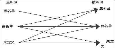 主/被叫黑白名單是號(hào)碼防火墻的一種簡易實(shí)現(xiàn)方式。黑白名單能夠在有限分類的情況下,提供相對(duì)豐富的權(quán)限控制能力。具體說,黑白名單就是把電話號(hào)碼分為三類,并定義這些分類之間的呼叫限制。(如圖2)