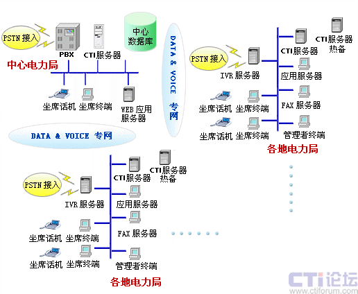 整個系統(tǒng)的物理構(gòu)成包括:程控交換機(jī)、CTI服務(wù)器、IVR/FAX服務(wù)器、業(yè)務(wù)代表座席、管理工作站(計費(fèi)、統(tǒng)計、系統(tǒng)管理、網(wǎng)絡(luò)管理)、電話錄音留言系統(tǒng)、數(shù)據(jù)庫服務(wù)器、應(yīng)用服務(wù)器、WWW服務(wù)器、網(wǎng)絡(luò)系統(tǒng)、網(wǎng)關(guān)等。