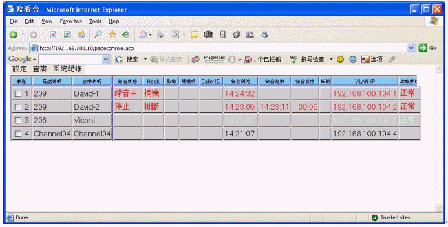 - 各軌道的實(shí)時(shí)狀態(tài)包括錄音狀態(tài)(錄音中、待命中)、錄音開(kāi)始時(shí)間、錄音結(jié)束時(shí)間、錄音長(zhǎng)度、撥號(hào)碼、Caller ID(DTMF或FSK皆可)、模擬線路狀態(tài)等皆能實(shí)時(shí)顯示。
