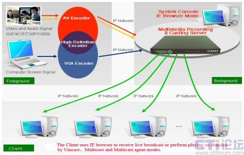 銳取的多媒體錄播系統(tǒng)最基本的功能是可對(duì)可視化信息進(jìn)行錄制,直播與點(diǎn)播。系統(tǒng)采用基于IP網(wǎng)絡(luò)的分布式架構(gòu),有前臺(tái)的編碼器及后臺(tái)的服務(wù)器組成。客戶端通過計(jì)算機(jī)接收。