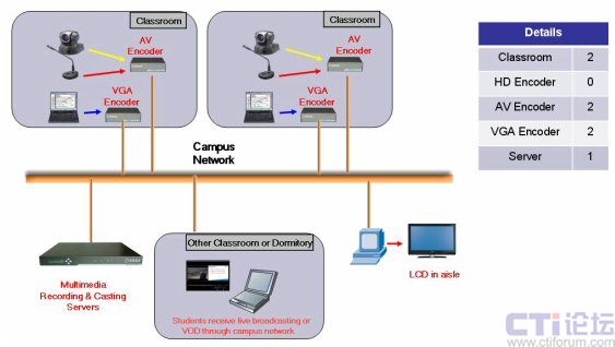 為了讓學(xué)生能更輕松地掌握課程內(nèi)容,學(xué)校的老師們希望可以有這樣一個(gè)系統(tǒng)可以將某個(gè)老師或?qū)<业闹v課內(nèi)容錄制下來,并能實(shí)時(shí)的傳到其它的教室,大堂,甚至學(xué)生的宿舍。而內(nèi)容必須包括老師的圖像及在電腦上播放的多媒體課件。通過這個(gè)系統(tǒng)學(xué)生可以隨時(shí)隨地的進(jìn)行到課程的學(xué)習(xí),構(gòu)建“無障礙學(xué)習(xí)校園”。