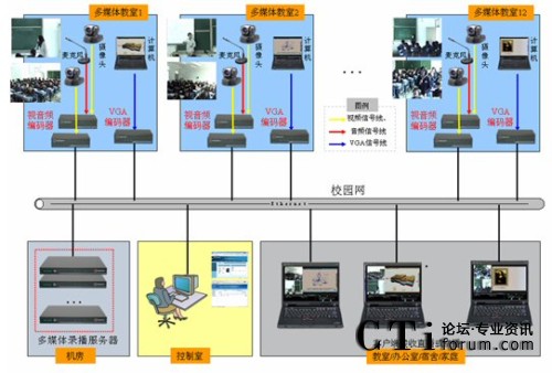華東師大多媒體錄播項目系統(tǒng)組網(wǎng)如上圖所示。在本項目中12間多媒體教室內(nèi)均實現(xiàn)錄播功能,編碼器和多媒體錄播服務器分別部署在教室和機房內(nèi),管理員在控制室通過網(wǎng)絡進行遠程管理、控制,老師、學生可在教室、辦公室、宿舍等任何可以連接校園網(wǎng)的地方實時觀看各間教室內(nèi)進行的課程,可滿足日常多媒體教學、課件錄制、微格教學等應用的需要。其中涉及銳取設備清單及說明如下: