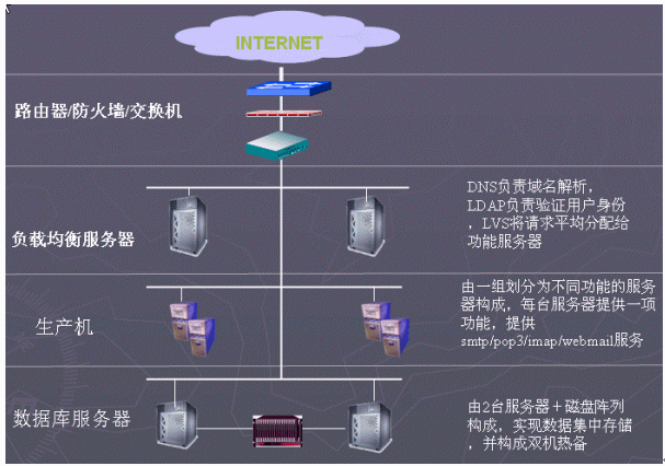 從軟件系統(tǒng)要求的分布式結構,并考慮到前期50萬郵箱的規(guī)模,為了兼顧性能和造價,建議采用高端IA架構服務器作為硬件平臺,另一方面充分考慮系統(tǒng)軟件的高可用性結構設計。