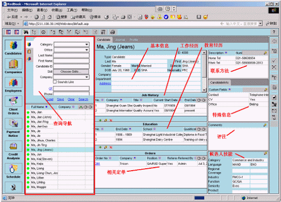 運行于瀏覽器、跨地域信息公享;人力資源信息專業(yè)、覆蓋全面;系統(tǒng)功能強大、操作簡單方便;靈活配置,可擴展性強;復(fù)雜的業(yè)務(wù)關(guān)聯(lián)性及專業(yè)的業(yè)務(wù)報表。全部采用模塊化設(shè)置,包含了候選人管理、客戶管理、雇員管理、定單管理、活動管理、績效管理、統(tǒng)計報表和系統(tǒng)維護管理等模塊,以及幾十項具體業(yè)務(wù)功能細節(jié)。系統(tǒng)功能模塊明細表如下: