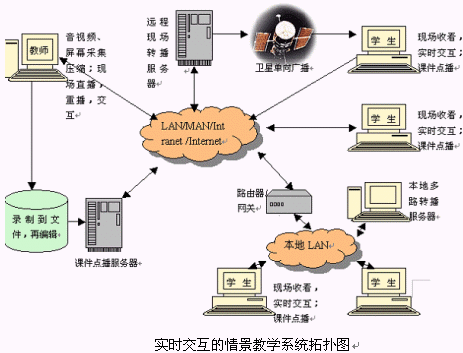 (5)通過先進的課件流多路廣播技術,最大限度地利用教師的勞動成果,讓更多的學生參加教師的教學活動。
