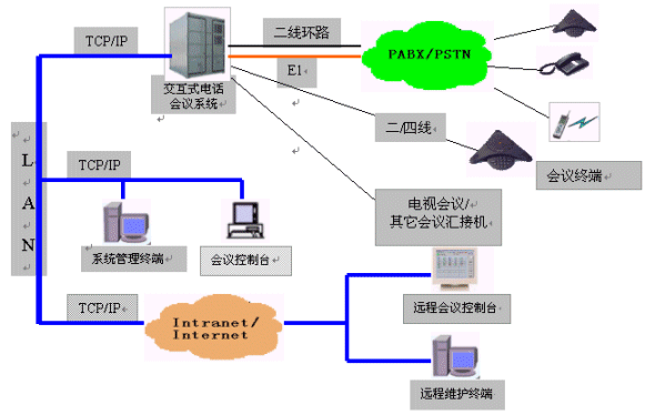 MCU-NT/I交互式電話會議系統(tǒng)為會議用戶提供了強大靈活的會議功能和豐富完善的網(wǎng)管功能。會議功能是在會議終端(或話機)和會議控制臺上實現(xiàn)的;網(wǎng)管功能是在系統(tǒng)維護終端上實現(xiàn)的,并在靈活的組網(wǎng)方式中體現(xiàn)出它的方便易用。系統(tǒng)可以外接多個會議控制臺及多個系統(tǒng)維護終端,并且可以通過企業(yè)網(wǎng)或互聯(lián)網(wǎng)的遠程連接,因此,所有功能都是可以遠程實現(xiàn)的。