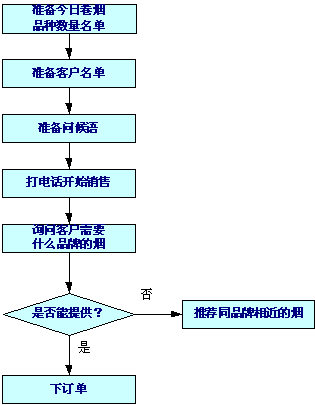。。我們的訪銷流程是:準(zhǔn)備今日卷煙品種數(shù)量名單---準(zhǔn)備客戶名單---準(zhǔn)備問候語---打電話開始銷售---先問客戶需要什么煙---如能提供的就下訂單。如有不能提供的,向其推薦同品牌相近的煙 。 (請(qǐng)?jiān)斠娨韵铝鞒虉D)