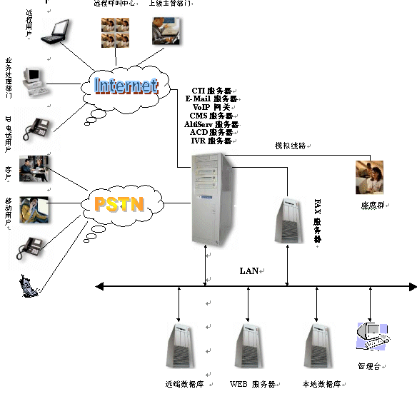 另一方面,CTI(計算機語音集成)技術(shù)的出現(xiàn),實現(xiàn)了通信技術(shù)與計算機技術(shù)的結(jié)合,利用計算機技術(shù)可以大大增加服務的信息量、提高速度、拓展新型客戶服務業(yè)務。因此為了滿足計算機、信息技術(shù)的演進和客戶服務的需求,利用CTI技術(shù),面向用戶,提供綜合服務的客戶服務中心系統(tǒng)應運而生。對于用戶,客戶服務中心系統(tǒng)能夠提供更優(yōu)質(zhì)的用戶服務,用戶能從服務方得到最快的響應,能夠得到24小時的持續(xù)服務,能夠同時得到語音、圖象、數(shù)據(jù)多方面的信息支持。對于企業(yè),客戶服務中心在提高客戶服務質(zhì)量的同時,還能有效的控制成本、增加收入,樹立專業(yè)化的企業(yè)形象,建立完善的客戶服務資料庫。