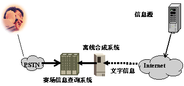 離線合成系統(tǒng)在用戶電話呼入前,將需要播放的文本信息預(yù)先轉(zhuǎn)換成語音文件存放在系統(tǒng)中,當電話用戶呼入系統(tǒng)后,系統(tǒng)直接向用戶播放事先生成的語音文件。離線合成方式適用于作賽事快報、明星風(fēng)采、賽場花絮等公共信息類信息服務(wù)。