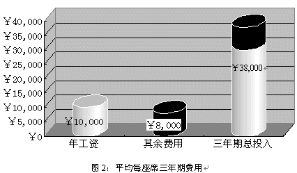 就中國目前的經(jīng)濟水平而言,一個座席人員年收入(包括工資、獎金、福利等等)大約為¥10,000,而每個座席人員所配備的軟硬件設(shè)施合計約為¥5,000;據(jù)專業(yè)機構(gòu)統(tǒng)計,中國的座席人員平均穩(wěn)定的工作年限為三年,而在這三年為了保證座席人員能夠準確、高效的實現(xiàn)對用戶提供專業(yè)服務(wù),所投入的培訓(xùn)費用大約為¥3,000。所以在三年期間為每個座席的平均花費為¥38,000。