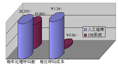 據(jù)統(tǒng)計,一個72線的IVR系統(tǒng)每年能夠處理2,300,000的接入電話,平均每線IVR一年能夠處理32,000個接入電話,依照60%的有效話務(wù)處理率(即80%的接入電話可以不轉(zhuǎn)人工即可完成服務(wù))來計算,即四年期每線的投入¥4569總共可以處理76,800個電話,即便是計算上系統(tǒng)維護費用,平均處理每個電話的成本僅為0.06元。