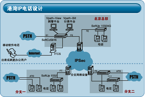 港灣網(wǎng)絡的IP電話系統(tǒng)是一個基于MGCP協(xié)議的IP電話系統(tǒng),由總部放置Softco5816語音交換機(主要功能是媒體網(wǎng)關控制器和部分媒體網(wǎng)關功能),用于接入用戶電話終端的Softup系列接入網(wǎng)關和軟電話系統(tǒng)(針對移動用戶和遠程辦公用戶)構(gòu)成。提供了計費、管理軟件,以及基于軟件方式的話務臺。
