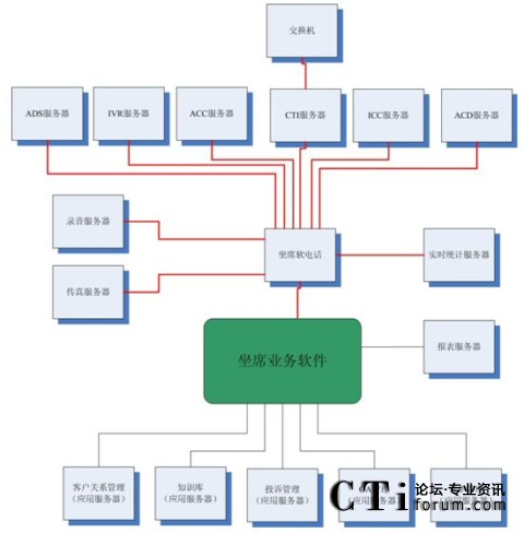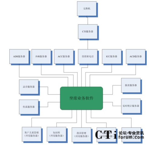 很多集成商或業(yè)務(wù)軟件開發(fā)商認為這種結(jié)構(gòu)過于復雜,而他們自身往往提供“整體解決方案”,即所有的服務(wù)器軟件基本上都是自己的,根據(jù)客戶的要求修改即可。例如,客戶關(guān)系管理、知識庫、投訴管理、OA、訂單管理以及坐席軟電話、ADS服務(wù)器、IVR服務(wù)器、ACC服務(wù)器、ICC服務(wù)器、ACD服務(wù)器、錄音服務(wù)器、傳真服務(wù)器、報表服務(wù)器、實時統(tǒng)計服務(wù)器都是自己來做,那么對于很多接口環(huán)節(jié)都可以節(jié)省了。