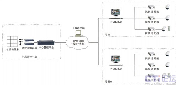 該部隊(duì)駐扎地為群島,擁有約70座附屬小島,計(jì)劃于總部所在地的主島布設(shè)10余個(gè)監(jiān)控點(diǎn),其它小島各設(shè)5個(gè)左右的監(jiān)控點(diǎn),監(jiān)控點(diǎn)位置主要為崗哨、山區(qū)坑道、微波發(fā)射站、軍需物資倉(cāng)庫等處。目前主島和其中兩座小島的監(jiān)控系統(tǒng)已布建完畢,每個(gè)島配1臺(tái)NVR和5~10個(gè)前端,前端由視頻適配器和模擬攝像機(jī)、報(bào)警等外設(shè)組成。