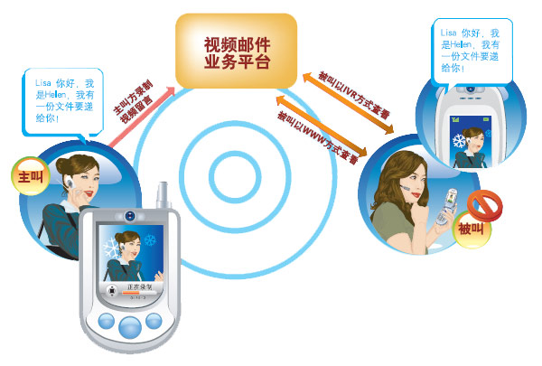 視頻郵件業(yè)務(wù)是在原有的語音郵件的基礎(chǔ)上又增加了極具個(gè)性化的視頻功能。即當(dāng)被呼叫方忙、在3G信號(hào)覆蓋區(qū)以外或是無法接聽時(shí)可以使用視頻郵件的功能。當(dāng)一個(gè)通話呼叫被切換到視頻郵件服務(wù)后,呼叫方首先將會(huì)看到一段視頻的歡迎信息,這可以是通過視頻片的方式預(yù)先錄制的個(gè)性化的視頻信息,也可以是預(yù)先設(shè)定的一個(gè)卡通形象。呼叫方可以錄下個(gè)人的視頻通話通過郵件方式傳遞給被叫。