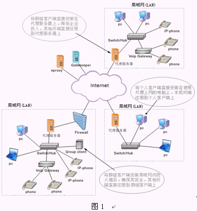 該系統(tǒng)建立在NGN基礎(chǔ)上,包括交換中心Asiasoft Gatekeeper,解決NAT、防火墻的代理軟件eProxy和視頻多點控制單元MCU,這些都建立在ITU制定的標準H.323協(xié)議上。一般單位和企業(yè)為便于管理和應用,都建設(shè)了使用私有IP 地址的局域網(wǎng)(LAN),當需要訪問外網(wǎng)時必須進行地址轉(zhuǎn)換(NAT)。局域網(wǎng)內(nèi)的終端之間進行呼叫和通信時沒有任何問題,但與外網(wǎng)終端進行VoIP通信時就會有問題產(chǎn)生,原因是局域網(wǎng)中的IP地址是私有的,在Internet中不可路由。為了解決VoIP通信協(xié)議不能穿越防火墻和NAT的問題,亞軟軟件技術(shù)股份有限公司推出了eProxy代理軟件。它可以在確保網(wǎng)絡(luò)安全、不改變已有設(shè)備和網(wǎng)絡(luò)環(huán)境的情況下,為用戶實現(xiàn)實時的點對點IP語音、視頻和數(shù)據(jù)通信服務(wù)。(如圖1所示)