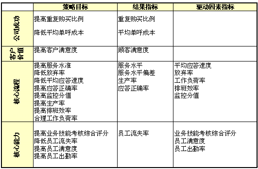 1)公司成功;2)客戶價值;3)核心流程;4)核心能力;成為呼叫中心全程全網(wǎng)考核衡量的四大維度,實際反映了呼叫中心運營管理中成本、客戶、內(nèi)部流程及呼叫中心的學(xué)習(xí)與成長的四個至關(guān)重要的領(lǐng)域,是實現(xiàn)公司遠景規(guī)劃與使命的營運管理核心。