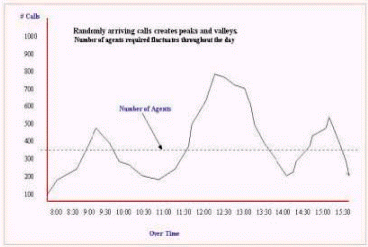 Inbound的來(lái)話(huà)量成不規(guī)則的波形圖,形成這種不規(guī)則波形圖中波峰和波谷的原因是在這些波峰和波谷工作的員工數(shù)量。(見(jiàn)圖8.來(lái)話(huà)量的分布圖)這將對(duì)在一天中的每個(gè)時(shí)段能夠分配最理想的員工來(lái)工作造成了最大的困難。一個(gè)小時(shí)能可能從來(lái)話(huà)量的波峰到達(dá)波谷,管理人員如何排班來(lái)匹配話(huà)務(wù)量對(duì)人員的要求,這是很多人的困惑。下圖描繪了某個(gè)呼叫中心8小時(shí)來(lái)話(huà)量分布情況。