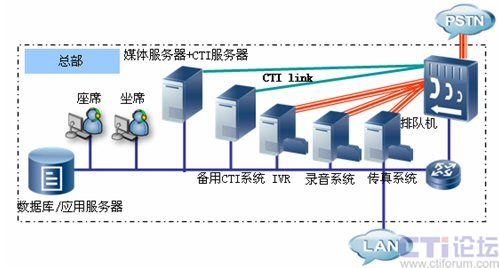 北京為總部中心,將部署CTI服務(wù)器、IVR服務(wù)器、錄音系統(tǒng)、傳真系統(tǒng)、文件服務(wù)器及相關(guān)業(yè)務(wù)數(shù)據(jù)庫服務(wù)器,為各個(gè)營(yíng)業(yè)網(wǎng)點(diǎn)提供業(yè)務(wù)支撐?偛繉(duì)整個(gè)網(wǎng)絡(luò)進(jìn)行管理,包括平臺(tái)配置、業(yè)務(wù)管理、數(shù)據(jù)管理、人員調(diào)度等。在總部CTI系統(tǒng)我們采用主備模式,確保了在出現(xiàn)網(wǎng)絡(luò)故障主CTI系統(tǒng)無法提供服務(wù)情況下,備用CTI系統(tǒng)將接替主CTI系統(tǒng)工作,確保了整個(gè)系統(tǒng)的正常工作。硬件平臺(tái)方面,UAP我們采用了雙主控板雙電源供電工作模式,這對(duì)系統(tǒng)長(zhǎng)期穩(wěn)定工作提供了保障。總部同時(shí)也部署北京農(nóng)村商業(yè)銀行300個(gè)坐席人員,這些坐席人員可以按照業(yè)務(wù)進(jìn)行區(qū)分,大部分坐席精通一般的業(yè)務(wù),為普通客戶提供優(yōu)質(zhì)服務(wù),少部分坐席(專業(yè)坐席)人員為高價(jià)值客戶提供高級(jí)的專業(yè)的優(yōu)質(zhì)服務(wù),在普通坐席比較忙時(shí),專業(yè)坐席可以為普通用戶提供服務(wù),坐席中,還有極少部分可以充當(dāng)坐席管理員角色,他們也可以監(jiān)控各個(gè)分中心坐席服務(wù)的質(zhì)量,對(duì)有問題服務(wù)可以實(shí)現(xiàn)監(jiān)聽、監(jiān)察、和強(qiáng)拆功能,及時(shí)的保證服務(wù)質(zhì)量,維護(hù)了企業(yè)形象。