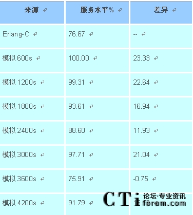 (表一:Erlang C與話務(wù)模擬之Service Level差異表)