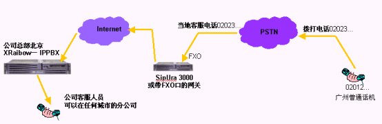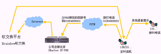 - 跨地域來電轉(zhuǎn)接,比如某個分支機(jī)構(gòu)的客戶撥叫該分支機(jī)構(gòu)電話,電話接起后,如果客戶需求沒有得到順利的答復(fù),在客戶電話保持的情況下,可以將電話轉(zhuǎn)接到在全國的任何一個IPPBX分機(jī)上。