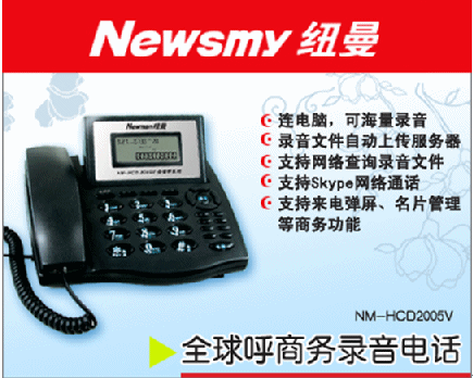 近日,北京紐曼公司(www.newman-cti.com)推出的一款具備強大商務(wù)管理功能的NM-HCD2005V全球呼商務(wù)錄音電話,以其強大的錄音和獨特的客戶信息管理功能獲得了消費者的青睞。據(jù)了解,這款商務(wù)錄音電話除了具備傳統(tǒng)錄音電話的錄音和留言的功能之外,還支持網(wǎng)絡(luò)查詢、來電彈屏顯示、名片管理、撥打網(wǎng)絡(luò)電話、集中錄音管理,可將錄音上傳到企業(yè)服務(wù)器等強大實用的商務(wù)功能。
