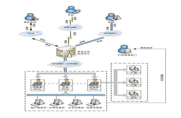 根據(jù)企業(yè)需求自動(dòng)生成產(chǎn)品防偽碼,并標(biāo)注在產(chǎn)品上,當(dāng)用戶開(kāi)或刮開(kāi)產(chǎn)品標(biāo)識(shí)物時(shí),用手機(jī)將防偽碼發(fā)送到企業(yè)短信防偽認(rèn)證平臺(tái),平臺(tái)將自動(dòng)對(duì)產(chǎn)品的真?zhèn)芜M(jìn)行驗(yàn)證,并將結(jié)果立即反饋給用戶。