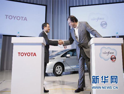 5月23日,日本豐田汽車公司總裁豐田章男(左)和美國Salesforce.com網(wǎng)站首席執(zhí)行官馬克・貝尼奧夫在東京共同出席新聞發(fā)布會。