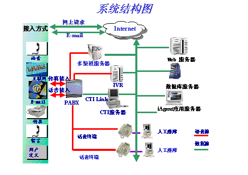 滿足呼叫中心多渠道接入的需求,使Internet呼叫中心成為現(xiàn)實。將網(wǎng)上ip電話請求納入傳統(tǒng)語音呼叫統(tǒng)一管理,無縫集成Email,傳真功能,實現(xiàn)網(wǎng)頁的互推瀏覽,文字交談,ip電話,網(wǎng)上資料發(fā)送等功能。