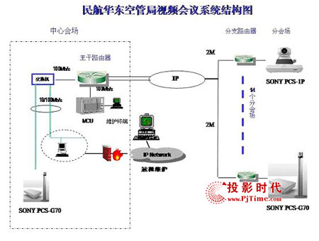 為了建成“具有華東特色,符合總局要求”的視頻會議系統(tǒng),空管局領導經過嚴格的考察和甄選后,最后采用了Sony的視頻會議系統(tǒng)解決方案,包括5臺PCS-G70和10臺PCS-1P。整個項目運行在民航數(shù)據(jù)網(ATM網)的環(huán)境下,共有24個節(jié)點,設備分布呈星型結構。