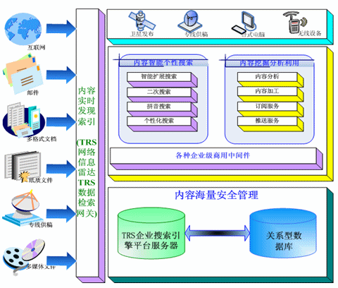 TRS公司推出的企業(yè)搜索引擎解決方案,利用TRS公司多年來自主開發(fā)的TRS Database Server作為企業(yè)搜索引擎服務的平臺?梢詫㈦娦牌髽I(yè)內外部多種格式、多種介質形態(tài)、多種存儲方式的內容信息,以實時的方式將這些信息進行索引。并且在索引的過程中力求能夠做到準確,并配合以相關智能語言技術做信息的去重、自動標引等能力。其框架如圖: