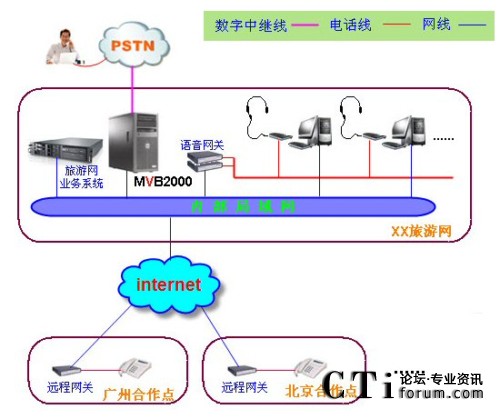 在技術上,旅游網(wǎng)IP呼叫中心解決方案的語音業(yè)務通過電信運營商的模擬電話線路(或者模擬中繼線路)接入,數(shù)據(jù)業(yè)務都通過互聯(lián)網(wǎng)使用TCP/IP協(xié)議傳送,解決了呼叫中心中大量數(shù)據(jù)傳送的需求,請看下面的網(wǎng)絡組織結(jié)構(gòu)圖: