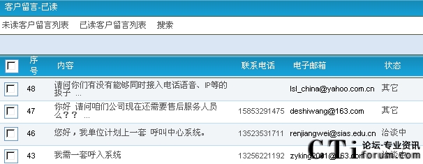 座席在CSR2000頁面可以查看到網(wǎng)站訪問者的流言,并可以作出標(biāo)記:聯(lián)系成功、無法聯(lián)系、洽談中、達(dá)成交易/合作、未達(dá)成、其他等,如下圖所示: