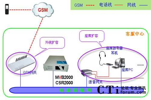 呼叫中心用于30路GSM網(wǎng)絡接入、20個座席人員使用,要求以后可擴展到50座席人員或者更多。