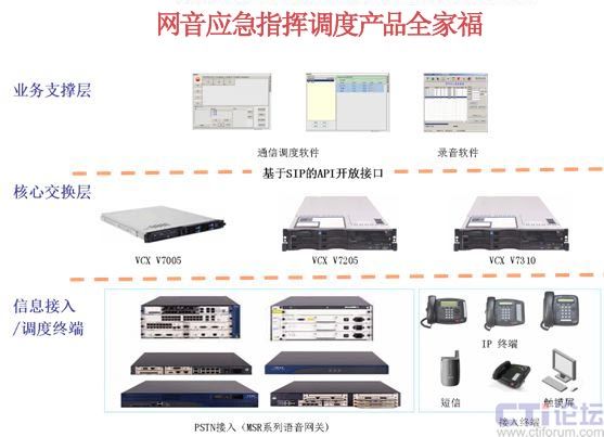“呼叫控制層”指應(yīng)用解決方案的核心組件-軟交換平臺VCX V7000,VCX V7000特點如下:   “信息接入/調(diào)度終端”多種不同類型的PSTN接入網(wǎng)關(guān)提供豐富的接入方式,并有多種IP調(diào)度終端可供選擇。