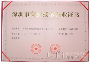 近期,迪威新軟件獲得了深圳市科技信息局頒發(fā)的“深圳市高新技術(shù)企業(yè)證書”。