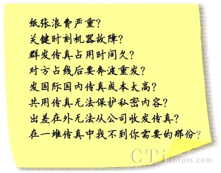 對于大多數(shù)企業(yè)而言,傳真有其不可替代的地位:銷售、采購、訂單、合同,這些企業(yè)的生命線都離不開傳真。使用傳統(tǒng)的傳真機(jī),您遇到過下列情況嗎?