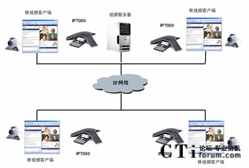 用戶現(xiàn)階段采用V2軟件視頻會議系統(tǒng),但現(xiàn)有的設備無法解決大型會議室的聲音處理問題。故新增PolycomSoundStation IP 7000音頻會議終端,并通過Polycom專有的計算機呼叫工具包使其與PC機相連,解決V2的軟件視頻會議系統(tǒng)大型會議室的聲音處理問題。