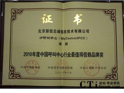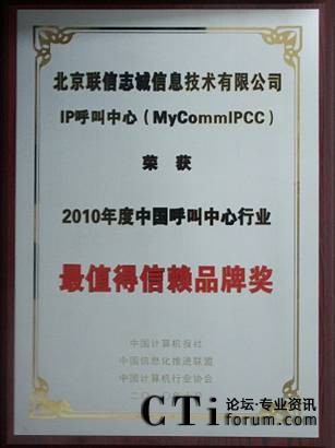 CTI論壇(ctiforum)11月1日消息(記者 潘婷婷):近日,在國(guó)家信息化專(zhuān)家咨詢(xún)委員會(huì)的指導(dǎo)下,作為中國(guó)信息化發(fā)展重要推動(dòng)力量的中國(guó)計(jì)算機(jī)報(bào)社、中國(guó)計(jì)算機(jī)行業(yè)協(xié)會(huì)、中國(guó)信息化推進(jìn)聯(lián)盟等國(guó)家級(jí)權(quán)威媒體及國(guó)家信息化領(lǐng)域一級(jí)權(quán)威機(jī)構(gòu),共同組織開(kāi)展“2010中國(guó)行業(yè)信息化讀者選擇獎(jiǎng)評(píng)選”,重點(diǎn)展示信息化在行業(yè)應(yīng)用中的優(yōu)秀應(yīng)用案例、產(chǎn)品及解決方案。由中國(guó)計(jì)算機(jī)報(bào)社組織業(yè)內(nèi)專(zhuān)家,在經(jīng)過(guò)歷時(shí)3個(gè)月的產(chǎn)品征集、方案論證、專(zhuān)家評(píng)審后,北京聯(lián)信志誠(chéng)信息技術(shù)有限公司(簡(jiǎn)稱(chēng)MyComm公司),其核心產(chǎn)品MyCommIPCC獨(dú)占2010年中國(guó)呼叫中心行業(yè)最值得信賴(lài)品牌獎(jiǎng)。