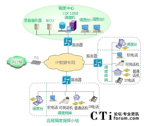 本系統(tǒng)為全I(xiàn)P的開(kāi)放式體系架構(gòu),由IP調(diào)度機(jī)、調(diào)度臺(tái)和調(diào)度終端三部分構(gòu)成。